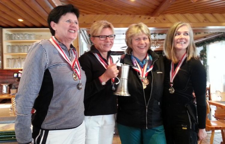 Die FDP-Kantonsrätinnen Doris Kälin (von links), Eva Isenschmid, Marlene Müller und Sibylle Ochsner holten sich den Gruppensieg im Parlamentarierskirennen in Rothenthurm.