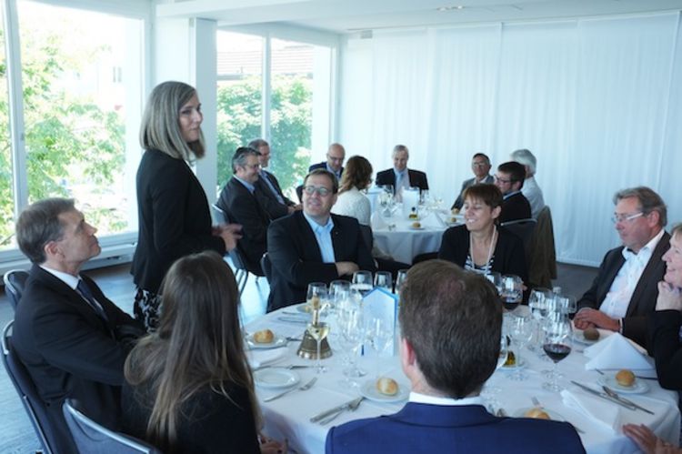 Gastgeberin FDP-Fraktionspräsidentin Sibylle Ochsner (stehend) konnte in Lachen viele bekannte Liberale zum traditionellen FDP-Fraktionsausflug begrüssen.